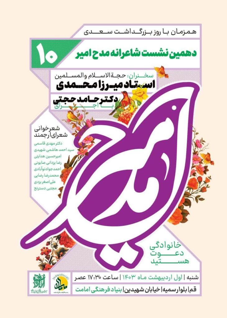دهمین نشست شاعرانه مدح امیر همزمان با روز بزرگداشت سعدی به همت معاونت فرهنگی و تبلیغی بنیاد فرهنگی امامت در قم برگزار می شود.
