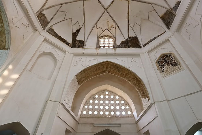 تزئینات بنای این خانه شامل گچبری شبه سجادهای و مشبکهای گچی در نورگیرهاست. گچ بریهای ساده با کاربندیهای زیبای سقف فضای معماری عصر صفویه را برای هر بینندهای تشریح میکند. محوطه اصلی این بنا سقف گنبدی شکل دارد و در رأس گنبد آن، شیشههای رنگی نور را به داخل بنا هدایت میکند.