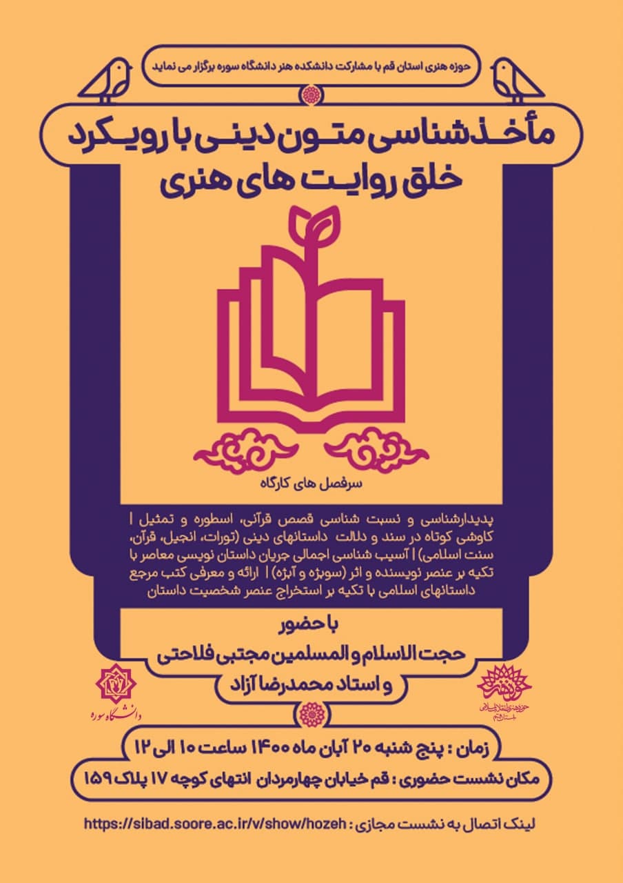 نشست «مأخذ شناسی متون دینی با رویکرد خلق روایتهای هنری» به همت حوزه هنری استان قم و همکاری دانشکده هنر سوره برگزار میشود.