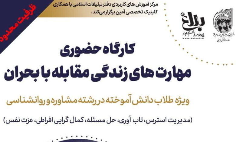کارگاه حضوری مهارت های زندگی مقابله با بحران ویژه طلاب دانش آموخته در رشته مشاوره و روانشناسی از سوی مرکز آموزش‌های کاربردی دفتر تبلیغات اسلامی با همکاری کلینیک تخصصی آمین برگزار می‌ شود.